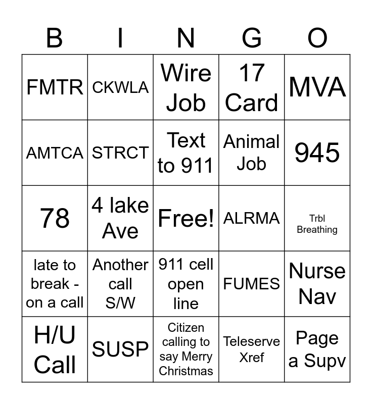 This bingo card has a free space and 24 words: H/U Call, Another call S/W, Text to 911, Teleserve Xref, MVA, FMTR, CKWLA, Wire Job, ALRMA, Trbl Breathing, 78, STRCT, FUMES, Nurse Nav, AMTCA, SUSP, Citizen calling to say Merry Christmas, 17 Card, 945, late to break - on a call, 4 lake Ave, 911 cell open line, Animal Job and Page a Supv.