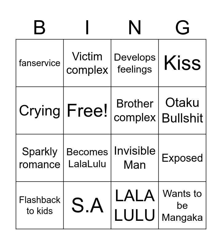 This bingo card has 16 words: S.A, Exposed, Develops feelings, fanservice, Sparkly romance, Victim complex, Invisible Man, LALA LULU, Crying, Free!, Flashback to kids, Kiss, Becomes LalaLulu, Otaku Bullshit, Brother complex and Wants to be Mangaka.