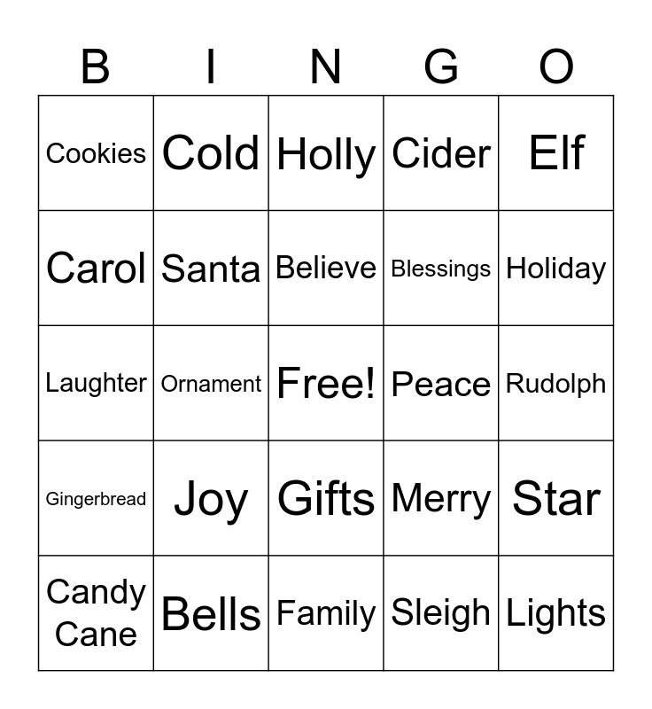 This bingo card has a free space and 29 words: Candy Cane, Stocking, Ornament, Snow, Cookies, Holly, Santa, Joy, Peace, Bells, Rudolph, Lights, Family, Sleigh, Holiday, Hot Chocolate, Gifts, Gingerbread, Elf, Laughter, Merry, Northpole, Blessings, Carol, Cider, Cold, Star, Believe and Angel.