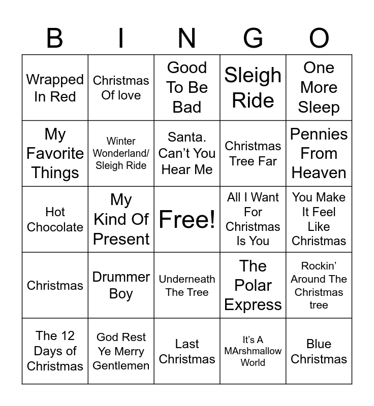This bingo card has a free space and 67 words: You’re A Mean One ,Mr. Grinch, It’s Beginning To Look a Lot Like Christmas, I Am The Grinch, Rockin’ Around The Christmas tree, It’s The Most Wonderful Time Of The Year, Frosty The Snowman, Christmas Of love, Christmas Is, Santa. Can’t You Hear Me, Snowman, Underneath The Tree, Santa Tell Me, You Make It Feel Like Christmas, One More Sleep, Holly Jolly Christmas, My Favorite Things, My Kind Of Present, Wrapped In Red, I want a Hippopotamus for Christmas, Christmas Tree Far, Drummer Boy, Christmas, Sleigh Ride, It’s A MArshmallow World, Oh, It’s Christmas, I’m Getting Nuttin for Christmas, Linus and Lucy, I’ve Got My Love To Keep Me Warm, Pennies From Heaven, Carol of The Bells, Blue Christmas, Making Christmas, Winter in St Louis, What’s This ?, Surfin Santa, The 12 Days of Christmas, ( Everybody’s Waitin’ for) The man with The Bag, The Polar Express, Hot Chocolate, Holiday Road, Jingle Bell Rock, Winter Wonderland/ Sleigh Ride, All I Want For Christmas Is You, I Saw Mommy Kissing Santa Claus, Santa’s Got a Dirty Job, Run Rudolph Run, Christmas In Hollis, God Rest Ye Merry Gentlemen, Deck The Halls, Here Comes Santa Claus, Good To Be Bad, Let It Snow! Let It Snow! Let It Snow!, A Holly Jolly Christmas, What Christmas Means To Me, Santa Claus Is Coming To Town, Last Christmas, Wonderful Christmastime, The Chipmunk Song, Oh Santa, Baby It’s Cold Outside, Mistletoe And Holly, Holidays, Little Saint Nick, Feliz Navidad, Driving Home For Christmas, My Only Wish and Jingle Bells.