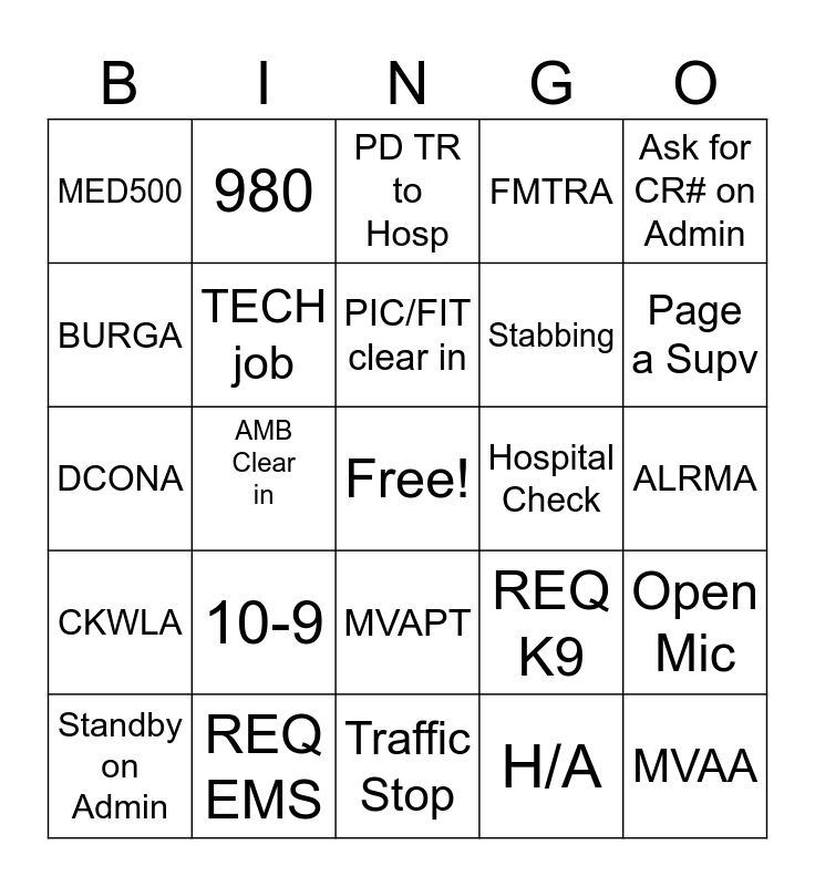 This bingo card has a free space and 24 words: 10-9, REQ EMS, PIC/FIT clear in, Standby on Admin, Ask for CR# on Admin, MED500, BURGA, 980, Hospital Check, MVAPT, Stabbing, DCONA, REQ K9, Open Mic, TECH job, H/A, ALRMA, PD TR to Hosp, Page a Supv, AMB Clear in, MVAA, CKWLA, FMTRA and Traffic Stop.