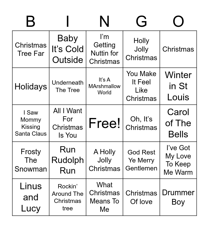This bingo card has a free space and 58 words: It’s Beginning To Look a Lot Like Christmas, Rockin’ Around The Christmas tree, It’s The Most Wonderful Time Of The Year, Frosty The Snowman, Christmas Of love, Snowman, Underneath The Tree, Santa Tell Me, You Make It Feel Like Christmas, One More Sleep, Holly Jolly Christmas, My Favorite Things, My Kind Of Present, Wrapped In Red, I want a Hippopotamus for Christmas, Christmas Tree Far, Drummer Boy, Christmas, Sleigh Ride, It’s A MArshmallow World, Oh, It’s Christmas, I’m Getting Nuttin for Christmas, Linus and Lucy, I’ve Got My Love To Keep Me Warm, Pennies From Heaven, Carol of The Bells, Blue Christmas, Making Christmas, Winter in St Louis, Surfin Santa, The 12 Days of Christmas, ( Everybody’s Waitin’ for) The man with The Bag, The Polar Express, Hot Chocolate, Holiday Road, Jingle Bell Rock, Winter Wonderland/ Sleigh Ride, All I Want For Christmas Is You, I Saw Mommy Kissing Santa Claus, Santa’s Got a Dirty Job, Run Rudolph Run, Christmas In Hollis, God Rest Ye Merry Gentlemen, Deck The Halls, Here Comes Santa Claus, Good To Be Bad, Let It Snow! Let It Snow! Let It Snow!, A Holly Jolly Christmas, What Christmas Means To Me, Santa Claus Is Coming To Town, Last Christmas, Wonderful Christmastime, The Chipmunk Song, Oh Santa, Baby It’s Cold Outside, Mistletoe And Holly, Holidays and Little Saint Nick.