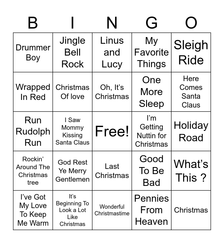 This bingo card has a free space and 62 words: You’re A Mean One ,Mr. Grinch, It’s Beginning To Look a Lot Like Christmas, I Am The Grinch, Rockin’ Around The Christmas tree, It’s The Most Wonderful Time Of The Year, Frosty The Snowman, Christmas Of love, Christmas Is, One More Sleep, Holly Jolly Christmas, My Favorite Things, My Kind Of Present, Wrapped In Red, I want a Hippopotamus for Christmas, Christmas Tree Far, Drummer Boy, Christmas, Sleigh Ride, It’s A MArshmallow World, Oh, It’s Christmas, I’m Getting Nuttin for Christmas, Linus and Lucy, I’ve Got My Love To Keep Me Warm, Pennies From Heaven, Carol of The Bells, Blue Christmas, Making Christmas, Winter in St Louis, What’s This ?, Surfin Santa, The 12 Days of Christmas, ( Everybody’s Waitin’ for) The man with The Bag, The Polar Express, Hot Chocolate, Holiday Road, Jingle Bell Rock, Winter Wonderland/ Sleigh Ride, All I Want For Christmas Is You, I Saw Mommy Kissing Santa Claus, Santa’s Got a Dirty Job, Run Rudolph Run, Christmas In Hollis, God Rest Ye Merry Gentlemen, Deck The Halls, Here Comes Santa Claus, Good To Be Bad, Let It Snow! Let It Snow! Let It Snow!, A Holly Jolly Christmas, What Christmas Means To Me, Santa Claus Is Coming To Town, Last Christmas, Wonderful Christmastime, The Chipmunk Song, Oh Santa, Baby It’s Cold Outside, Mistletoe And Holly, Holidays, Little Saint Nick, Feliz Navidad, Driving Home For Christmas, My Only Wish and Jingle Bells.