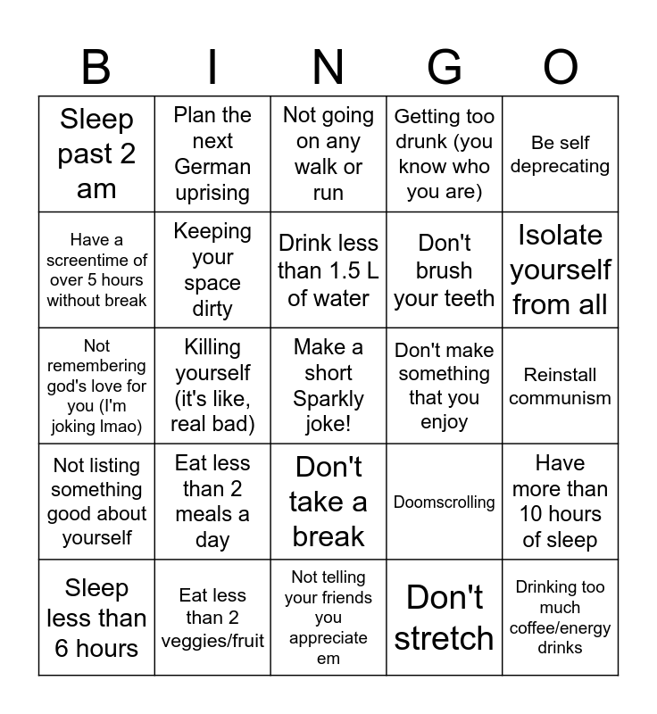 This bingo card has a free space and 24 words: Eat less than 2 meals a day, Eat less than 2 veggies/fruit, Drink less than 1.5 L of water, Sleep less than 6 hours, Be self deprecating, Sleep past 2 am, Have a screentime of over 5 hours without break, Plan the next German uprising, Don't make something that you enjoy, Don't take a break, Don't brush your teeth, Not remembering god's love for you (I'm joking lmao), Doomscrolling, Have more than 10 hours of sleep, Keeping your space dirty, Don't stretch, Reinstall communism, Not going on any walk or run, Isolate yourself from all, Killing yourself (it's like, real bad), Drinking too much coffee/energy drinks, Not listing something good about yourself, Getting too drunk (you know who you are) and Not telling your friends you appreciate em.