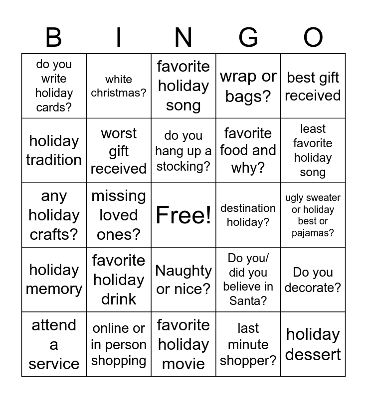 This bingo card has a free space and 24 words: favorite holiday drink, online or in person shopping, do you hang up a stocking?, attend a service, best gift received, do you write holiday cards?, holiday tradition, white christmas?, destination holiday?, Naughty or nice?, favorite food and why?, any holiday crafts?, Do you/ did you believe in Santa?, Do you decorate?, worst gift received, last minute shopper?, ugly sweater or holiday best or pajamas?, favorite holiday song, least favorite holiday song, missing loved ones?, holiday dessert, holiday memory, wrap or bags? and favorite holiday movie.