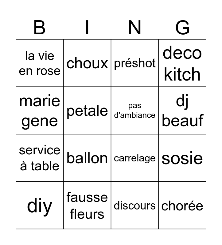 This bingo card has 16 words: fausse fleurs, sosie, préshot, la vie en rose, service à table, choux, carrelage, discours, marie gene, petale, diy, deco kitch, ballon, dj beauf, pas d'ambiance and chorée.