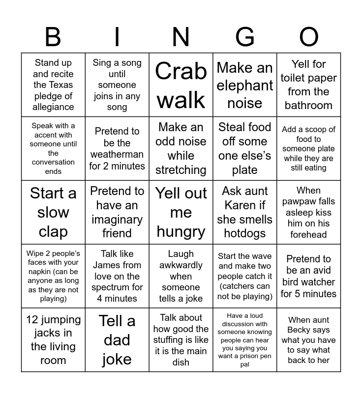 This bingo card has 25 words: Talk like James from love on the spectrum for 4 minutes, Talk about how good the stuffing is like it is the main dish, Make an odd noise while stretching, 12 jumping jacks in the living room, Yell for toilet paper from the bathroom, Stand up and recite the Texas pledge of allegiance, Speak with a accent with someone until the conversation ends, Sing a song until someone joins in any song, Ask aunt Karen if she smells hotdogs, Laugh awkwardly when someone tells a joke, Steal food off some one else’s plate, Start a slow clap, Start the wave and make two people catch it (catchers can not be playing), Pretend to be an avid bird watcher for 5 minutes, Pretend to be the weatherman for 2 minutes, When aunt Becky says what you have to say what back to her, When pawpaw falls asleep kiss him on his forehead, Crab walk, Add a scoop of food to someone plate while they are still eating, Pretend to have an imaginary friend, Yell out me hungry, Tell a dad joke, Wipe 2 people’s faces with your napkin (can be anyone as long as they are not playing), Make an elephant noise and Have a loud discussion with someone knowing people can hear you saying you want a prison pen pal.