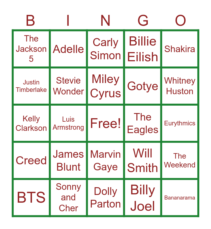 This bingo card has a free space and 30 words: Sonny and Cher, The Beatles, Luis Armstrong, The Monkees, The Jackson 5, Carly Simon, Stevie Wonder, Marvin Gaye, The Eagles, Dolly Parton, Eurythmics, Bananarama, Billy Joel, Vanilla Ice, Whitney Huston, The Spice Girls, Will Smith, Creed, James Blunt, Shakira, Kelly Clarkson, Bruno Mars, Adelle, Gotye, Justin Timberlake, Billie Eilish, The Weekend, BTS, Miley Cyrus and Beyonce.