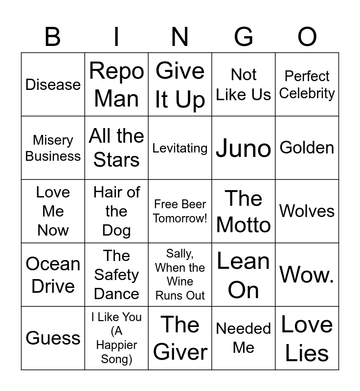 This bingo card has a free space and 57 words: Hot to Go!, Guess, Abracadabra, Disease, The Giver, Denial is a River, All the Stars, Super Graphic Ultra Modern Girl, Juno, How Bad Do U Want Me, Not Like Us, Bad Chem, Pink Pony Club, Garden of Eden, Residuals, Good Luck, Babe!, Perfect Celebrity, Hair of the Dog, Magnets, Love Lies, The Motto, BIRDS OF A FEATHER, Lean On, Give It Up, Hot Blood, Levitating, She's a Bad Mama Jama, Mama Told Me (Not to Come), Golden, 6's to 9's, Decode, no tears left to cry, Shake Appeal, Wolf Like Me, Wolves, Misery Business, Tears, Love Me Now, Walk Me Home, Ocean Drive, Repo Man, Sally, When the Wine Runs Out, Shots, Slow Burn, Lost Without You, Espresso, The Safety Dance, I Like You (A Happier Song), Talking Body, Manchild, Rain On Me, Needed Me, L$D, A Girl Like You, Animals, Wow. and WOMAN'S WORLD.