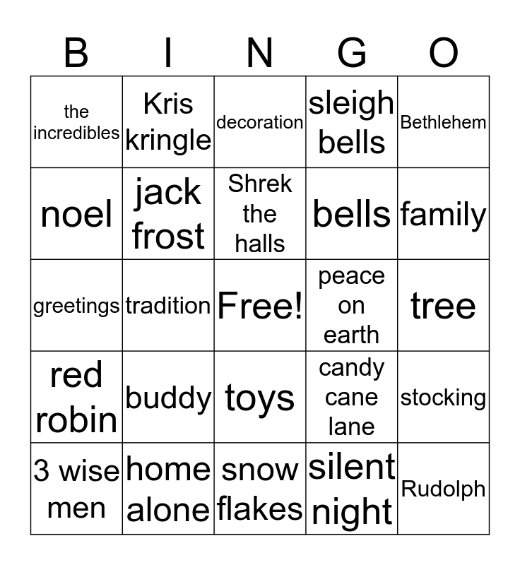 This bingo card has a free space and 24 words: buddy, home alone, Shrek the halls, 3 wise men, Bethlehem, the incredibles, noel, Kris kringle, peace on earth, toys, bells, greetings, candy cane lane, stocking, jack frost, silent night, tree, decoration, family, tradition, Rudolph, red robin, sleigh bells and snow flakes.