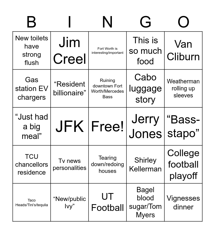 This bingo card has a free space and 52 words: Dallas v Fort Worth, Vignesses dinner, TCU is cool, UT Football, Tv news personalities, Bada Bing cherries, Jim Creel, Time difference, Gas station EV chargers, Frankfurt/Lufthansa, “Resident billionaire”, Grapes across the street, College football playoff, Shirley Kellerman, Vigness husbands are boring, Good seat at church, Ruining downtown Fort Worth/Mercedes Bass, Jerry Jones, Best BBQ place, Van Cliburn, JFK, Bagel blood sugar/Tom Myers, New toilets have strong flush, Cabo luggage story, Hemingway bar in Paris, Electric Ford pickup truck, Western view, Yuengling, Weatherman rolling up sleeves, ABBA musical, Texas Tech trans dorm, This is so much food, Real glasses in hotels, Fishing shirts, Fort Worth distilleries, Fort Worth is interesting/important, “New/public Ivy”, UT is great, Fixing toilet in west wing, You’re a family/dishwasher, Kids clearing the table, “Bass-stapo”, TCU chancellors residence, Johnny Chang, Tearing down/redoing houses, Broadmoor, Mrs. Baird’s bread, “Just had a big meal”, Leave car windows open, Whit peeking in bathroom, Taco Heads/Tini’s/tequila and Cynthia Erivo appearance.