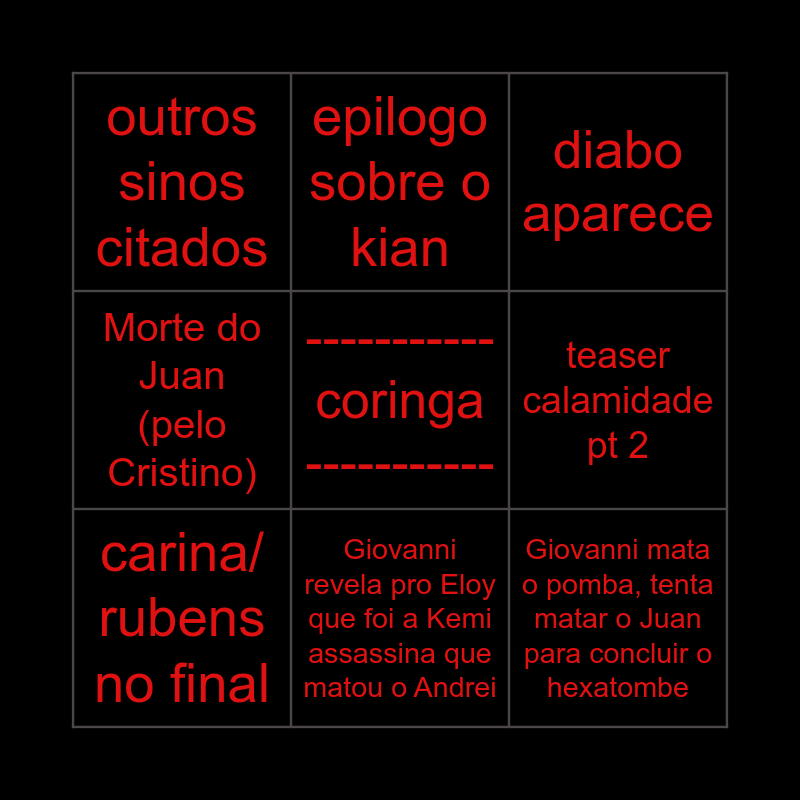 This bingo card has a free space and 8 words: teaser calamidade pt 2, diabo aparece, epilogo sobre o kian, carina/ rubens no final, outros sinos citados, Giovanni mata o pomba, tenta matar o Juan para concluir o hexatombe, Morte do Juan (pelo Cristino) and Giovanni revela pro Eloy que foi a Kemi assassina que matou o Andrei.
