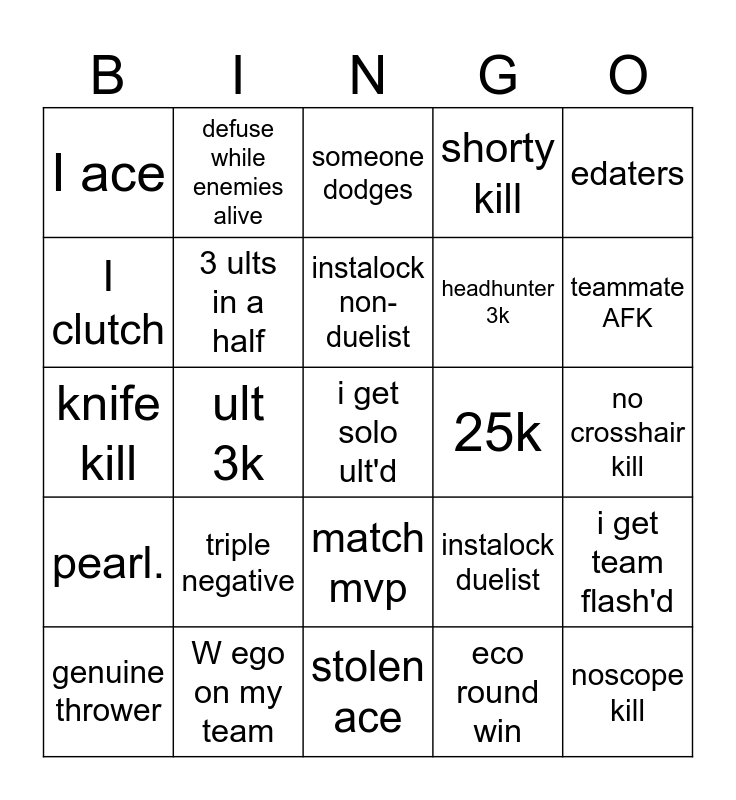 This bingo card has 25 words: triple negative, stolen ace, instalock non-duelist, genuine thrower, edaters, I ace, I clutch, defuse while enemies alive, 25k, match mvp, headhunter 3k, knife kill, instalock duelist, i get team flash'd, 3 ults in a half, noscope kill, no crosshair kill, someone dodges, teammate AFK, ult 3k, i get solo ult'd, W ego on my team, pearl., shorty kill and eco round win.