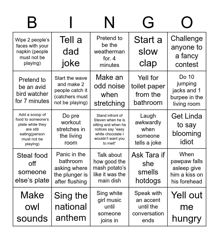 This bingo card has a free space and 24 words: Panic in the bathroom asking where the plunger is after flushing, Sing the national anthem, Make an odd noise when stretching, Make owl sounds, Challenge anyone to a fancy contest, Wipe 2 people’s faces with your napkin (people must not be playing), Pretend to be an avid bird watcher for 7 minutes, Tell a dad joke, Laugh awkwardly when someone tells a joke, Talk about how good the mash potato’s like it was the main dish, Yell for toilet paper from the bathroom, Add a scoop of food to someone’s plate while they are still eating(person must not be playing), Ask Tara if she smells hotdogs, When pawpaw falls asleep give him a kiss on his forehead, Start the wave and make 2 people catch it (catchers must not be playing), Speak with an accent until the conversation ends, Get Linda to say blooming idiot, Pretend to be the weatherman for. 4 minutes, Do 10 jumping jacks and 1 burpee in the living room, Do pre workout stretches in the living room, Yell out me hungry, Steal food off someone else’s plate, Start a slow clap and Sing white girl music until someone joins in.