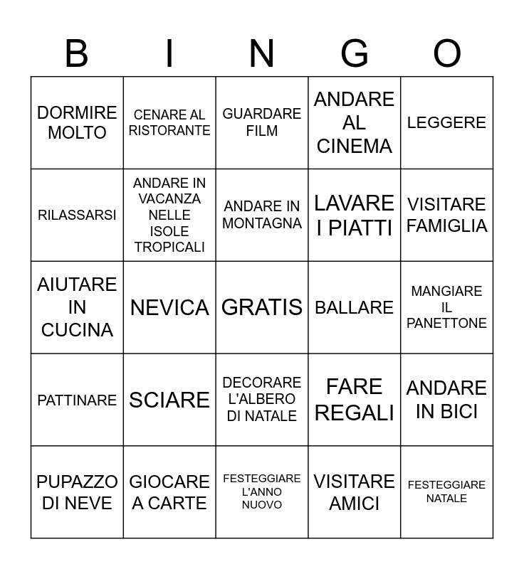 This bingo card has a free space and 29 words: PUPAZZO DI NEVE, CIOCCOLATA CALDA, NEVICA, FARE BISCOTTI, DORMIRE MOLTO, GUARDARE FILM, ANDARE IN VACANZA NELLE ISOLE TROPICALI, SCIARE, BALLARE, GIOCARE A CARTE, MANGIARE IL PANETTONE, FESTEGGIARE NATALE, FESTEGGIARE L'ANNO NUOVO, VISITARE AMICI, VISITARE FAMIGLIA, FARE SNOWBOARD, DECORARE L'ALBERO DI NATALE, PATTINARE, LEGGERE, AIUTARE IN CUCINA, FARE REGALI, FARE SHOPPING, LAVARE I PIATTI, RILASSARSI, ANDARE AL CINEMA, CENARE AL RISTORANTE, ANDARE IN BICI, ANDARE IN MONTAGNA and STUDIARE.