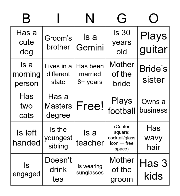 This bingo card has a free space and 25 words: Is the youngest sibling, Is wearing sunglasses, Has been married 8+ years, Is engaged, Plays guitar, Has a cute dog, Is a morning person, Groom’s brother, Plays football, Is a teacher, Mother of the bride, Has two cats, (Center square: cocktail/glass icon — free space), Has wavy hair, Lives in a different state, Is a coffee lover, Owns a business, Is a Gemini, Bride’s sister, Has a Masters degree, Has 3 kids, Doesn’t drink tea, Is left handed, Is 30 years old and Mother of the groom.