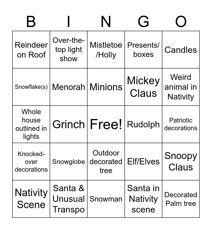 This bingo card has a free space and 24 words: Snowglobe, Santa & Unusual Transpo, Minions, Nativity Scene, Candles, Reindeer on Roof, Snowflake(s), Over-the-top light show, Rudolph, Outdoor decorated tree, Mickey Claus, Whole house outlined in lights, Elf/Elves, Snoopy Claus, Menorah, Santa in Nativity scene, Patriotic decorations, Mistletoe /Holly, Weird animal in Nativity, Grinch, Decorated Palm tree, Knocked-over decorations, Presents/ boxes and Snowman.