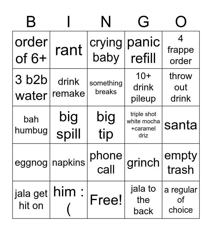 This bingo card has 25 words: eggnog, him :(, big tip, jala to the back, 4 frappe order, order of 6+, rant, crying baby, triple shot white mocha +caramel driz, empty trash, 3 b2b water, drink remake, Free!, grinch, throw out drink, jala get hit on, big spill, something breaks, 10+ drink pileup, santa, bah humbug, napkins, phone call, panic refill and a regular of choice.