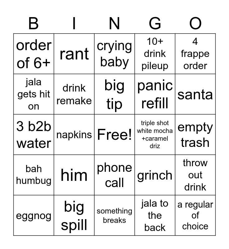 This bingo card has a free space and 24 words: eggnog, him, big tip, jala to the back, 4 frappe order, order of 6+, rant, crying baby, triple shot white mocha +caramel driz, empty trash, 3 b2b water, drink remake, grinch, throw out drink, jala gets hit on, big spill, something breaks, 10+ drink pileup, santa, bah humbug, napkins, phone call, panic refill and a regular of choice.
