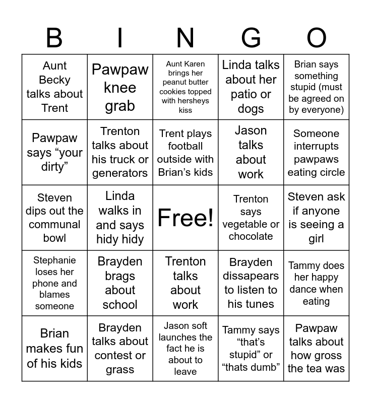 This bingo card has a free space and 24 words: Brayden brags about school, Brayden talks about contest or grass, Trent plays football outside with Brian’s kids, Brian makes fun of his kids, Brian says something stupid (must be agreed on by everyone), Aunt Becky talks about Trent, Pawpaw says “your dirty”, Pawpaw knee grab, Trenton says vegetable or chocolate, Trenton talks about work, Jason talks about work, Steven dips out the communal bowl, Brayden dissapears to listen to his tunes, Tammy does her happy dance when eating, Trenton talks about his truck or generators, Tammy says “that’s stupid” or “thats dumb”, Steven ask if anyone is seeing a girl, Aunt Karen brings her peanut butter cookies topped with hersheys kiss, Someone interrupts pawpaws eating circle, Linda walks in and says hidy hidy, Pawpaw talks about how gross the tea was, Stephanie loses her phone and blames someone, Linda talks about her patio or dogs and Jason soft launches the fact he is about to leave.