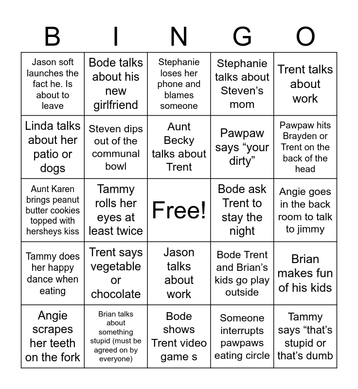 This bingo card has a free space and 24 words: Trent says vegetable or chocolate, Brian talks about something stupid (must be agreed on by everyone), Aunt Becky talks about Trent, Angie scrapes her teeth on the fork, Trent talks about work, Jason soft launches the fact he. Is about to leave, Linda talks about her patio or dogs, Bode talks about his new girlfriend, Bode ask Trent to stay the night, Jason talks about work, Pawpaw says “your dirty”, Aunt Karen brings peanut butter cookies topped with hersheys kiss, Bode Trent and Brian’s kids go play outside, Brian makes fun of his kids, Steven dips out of the communal bowl, Someone interrupts pawpaws eating circle, Angie goes in the back room to talk to jimmy, Stephanie loses her phone and blames someone, Pawpaw hits Brayden or Trent on the back of the head, Tammy rolls her eyes at least twice, Tammy says “that’s stupid or that’s dumb, Tammy does her happy dance when eating, Stephanie talks about Steven’s mom and Bode shows Trent video game s.
