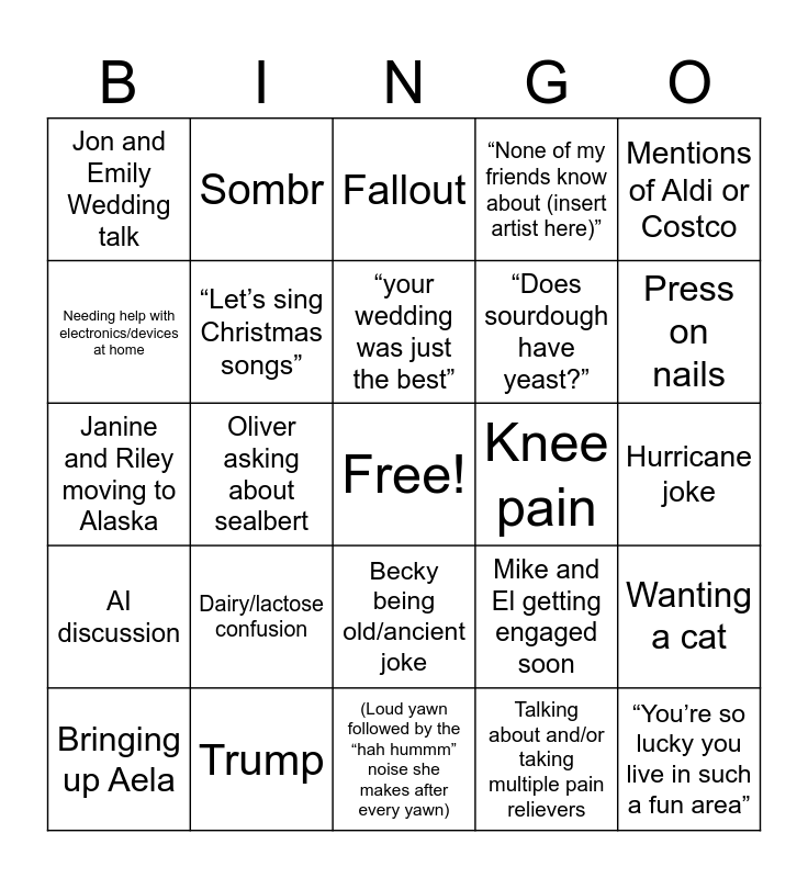 This bingo card has a free space and 24 words: Dairy/lactose confusion, Trump, “your wedding was just the best”, Bringing up Aela, Mentions of Aldi or Costco, Jon and Emily Wedding talk, Needing help with electronics/devices at home, Sombr, Knee pain, Becky being old/ancient joke, “Does sourdough have yeast?”, Janine and Riley moving to Alaska, Mike and El getting engaged soon, Wanting a cat, “Let’s sing Christmas songs”, Talking about and/or taking multiple pain relievers, Hurricane joke, Fallout, Press on nails, Oliver asking about sealbert, “You’re so lucky you live in such a fun area”, AI discussion, “None of my friends know about (insert artist here)” and (Loud yawn followed by the “hah hummm” noise she makes after every yawn).