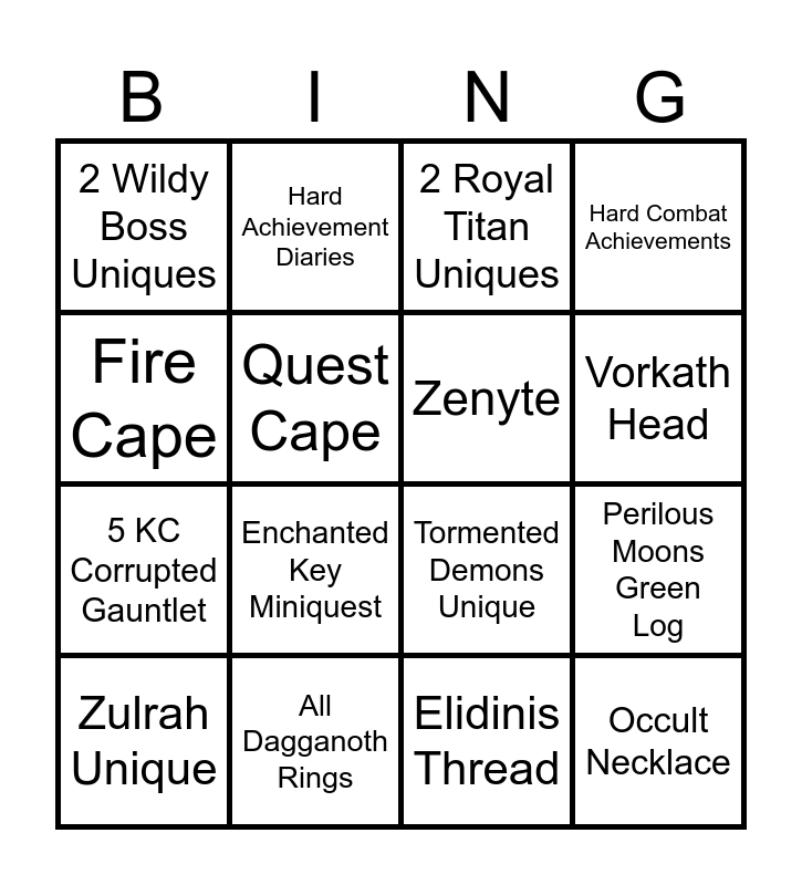 This bingo card has 16 words: All Dagganoth Rings, Perilous Moons Green Log, 2 Royal Titan Uniques, 2 Wildy Boss Uniques, 5 KC Corrupted Gauntlet, Hard Achievement Diaries, Tormented Demons Unique, Elidinis Thread, Fire Cape, Quest Cape, Zulrah Unique, Hard Combat Achievements, Enchanted Key Miniquest, Vorkath Head, Zenyte and Occult Necklace.