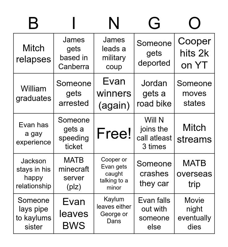This bingo card has a free space and 24 words: Someone lays pipe to kaylums sister, MATB minecraft server (plz), Evan winners (again), Evan falls out with someone else, Cooper hits 2k on YT, Mitch relapses, James gets based in Canberra, James leads a military coup, Will N joins the call atleast 3 times, Mitch streams, Evan has a gay experience, Someone gets arrested, Someone crashes they car, MATB overseas trip, William graduates, Evan leaves BWS, Kaylum leaves either George or Dans, Someone gets deported, Someone moves states, Jackson stays in his happy relationship, Someone gets a speeding ticket, Cooper or Evan gets caught talking to a minor, Jordan gets a road bike and Movie night eventually dies.
