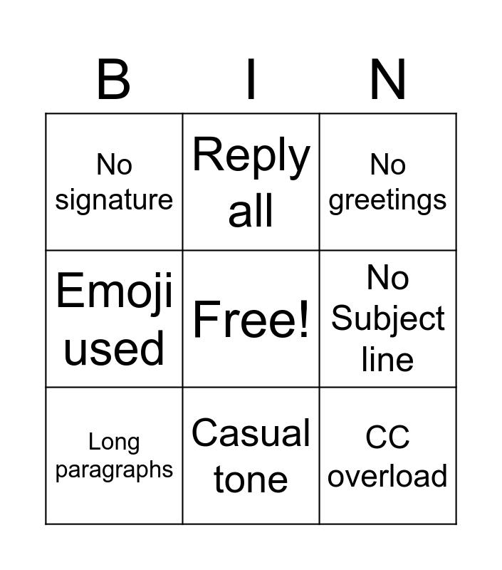 This bingo card has a free space and 8 words: No Subject line, No greetings, Reply all, Long paragraphs, No signature, CC overload, Emoji used and Casual tone.