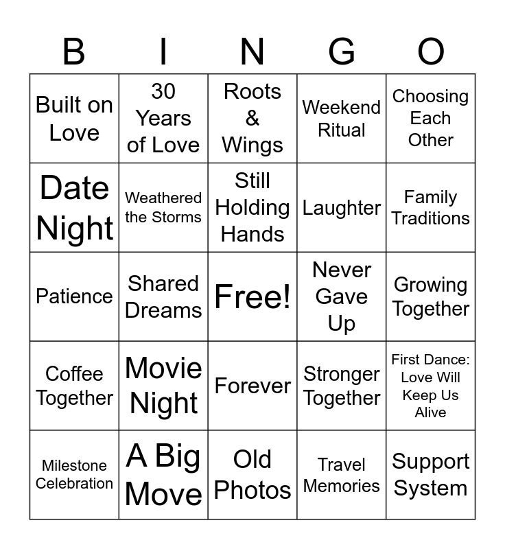 This bingo card has a free space and 67 words: First Date, Wedding Day, Proposal at a Japanese Restaurant, First Dance: Love Will Keep Us Alive, Forever Home in Lisbon, Pearl Anniversary, 30 Years of Love, Best Decision, Still Holding Hands, Hand in Hand, Forever, Soulmates, Growing Together, Choosing Each Other, Love Letters, Date Night, Shared Dreams, Built on Love, Inside Joke, Laughter, Movie Night, Coffee Together, Weekend Ritual, Travel Memories, Late Nights, Happy Tears, Celebration Time, Cheers to Love, Family Traditions, Family & Friends, Support System, Sunday Dinners, Holidays Together, Big Family Moments, Home Full of Love, Milestone Celebration, Tough Times, Stronger Together, Patience, Trust, Teamwork, Weathered the Storms, Never Gave Up, Proud Moment, First Home, New Beginnings, Forever Starts Here, A Big Move, Lisbon Life, Creating a Home, Roots & Wings, Love Across Years, Wedding Music, Favorite Song, Dance Floor Memories, Old Photos, Throwback Moment, Remember When…, Timeless Love, Happiness, Gratitude, Together Always, With Love, Blessed, Heartfelt, Celebration and Legacy of Love.