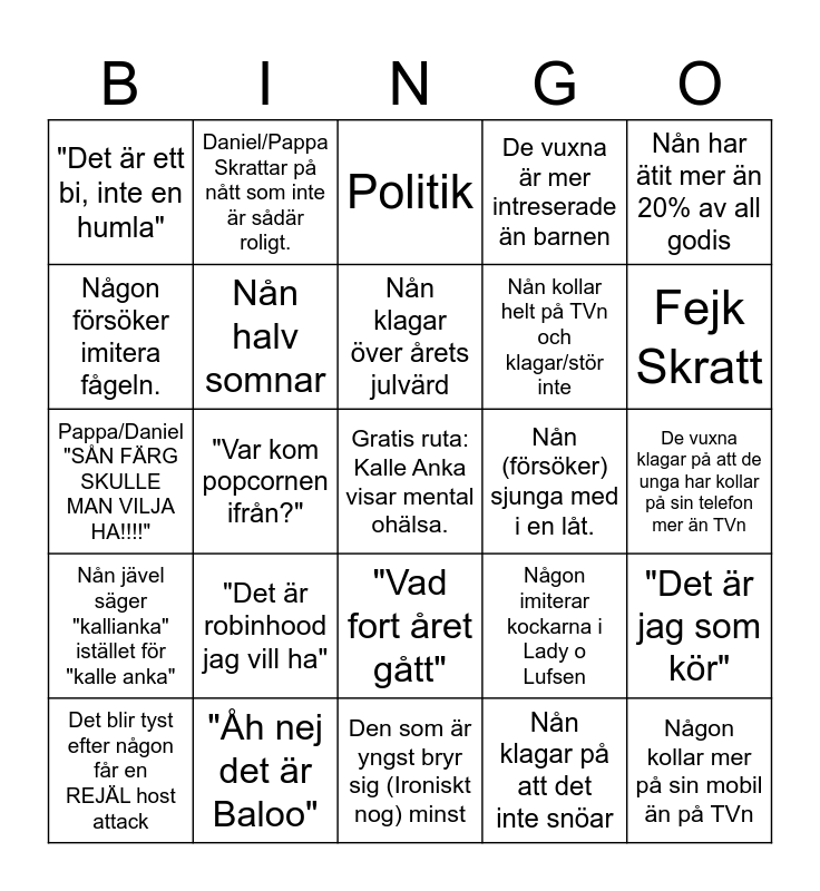 This bingo card has a free space and 40 words: Mamma imiterar mössens ljusa röster, Pappa/Daniel "SÅN FÄRG SKULLE MAN VILJA HA!!!!", Säger "Aj" när Ferdinand blir stungen av biett, Nån halv somnar, "Åh nej det är Baloo", "Vad fort året gått", Nån klagar över årets julvärd, Nån pratar om hur det var bättre förr, Nån har ätit mer än 20% av all godis, Nån jävel säger "kallianka" istället för "kalle anka", "Var kom popcornen ifrån?", De vuxna är mer intreserade än barnen, Någon kollar mer på sin mobil än på TVn, De vuxna klagar på att de unga har kollar på sin telefon mer än TVn, Nån (försöker) sjunga med i en låt., "Det är robinhood jag vill ha", "Här kommer din favoritdel [Familje medlem]", "Det är ett bi, inte en humla", Nån pratar om hur galet animation var på deras tid., Politik, "Det är jag som kör", Nån klagar på att det inte snöar, Nån kollar helt på TVn och klagar/stör inte, Någon försöker imitera fågeln., Någon går ifrån för nått(Toa räknas inte), "Va Tyst!", Nån citerar mer än 5 gånger, Någon klagar på de nya filmerna som visas, Saknar Arne Weise, Mer än en minut av inga komentarer, "Till Sherwood Skogen", Det blir tyst efter någon får en REJÄL host attack, Någon klagar över censur, Någon imiterar kockarna i Lady o Lufsen, Fejk Skratt, Den som är yngst bryr sig (Ironiskt nog) minst, Någon sitter på änden av soffan, Mamma försöker få sättet längs åt väggen, Daniel/Pappa Skrattar på nått som inte är sådär roligt. and Någon pratar om hur gammal julvärden är.