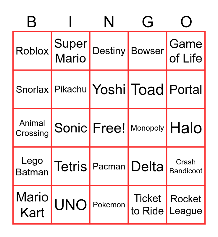 This bingo card has a free space and 29 words: Mario Kart, Minecraft, Sonic, Fortnite, Roblox, Destiny, Pikachu, Tetris, Monopoly, UNO, Halo, Rocket League, Pokemon, Ticket to Ride, Portal, Princess Peach, Pacman, Lego Batman, Game of Life, Animal Crossing, Delta, Kahoot, Toad, Snorlax, Bowser, Super Mario, Crash Bandicoot, Yoshi and Goomba.