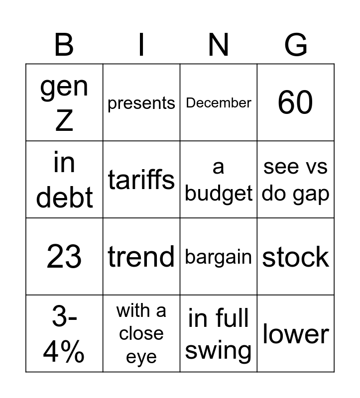 This bingo card has 16 words: with a close eye, stock, December, gen Z, 23, presents, bargain, in full swing, in debt, tariffs, 3-4%, 60, trend, see vs do gap, a budget and lower.