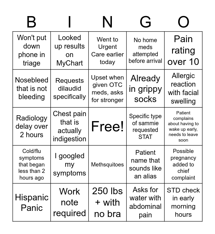 This bingo card has a free space and 29 words: Hispanic Panic, My veins roll, Chest pain that is actually indigestion, Patient needs help out of car, gets up themselves, Won't put down phone in triage, Went to Urgent Care earlier today, Requests dilaudid specifically, I googled my symptoms, Specific type of sammie requested STAT, Work note required, Patient complains about having to wake up early, needs to leave soon, STD check in early morning hours, 250 lbs + with no bra, Asks for water with abdominal pain, Allergic reaction with facial swelling, Complains about having to put on gown, Methsquitoes, Cold/flu symptoms that began less than 2 hours ago, Pain rating over 10, Radiology delay over 2 hours, Patient name that sounds like an alias, Toothache, Already in grippy socks, Nosebleed that is not bleeding, No home meds attempted before arrival, Looked up results on MyChart, Possible pregnancy added to chief complaint, Upset when given OTC meds, asks for stronger and Outline of EKG stickers on chest.