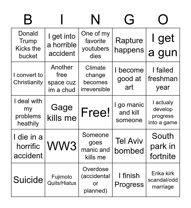 This bingo card has a free space and 24 words: WW3, Fujimoto Quits/Hiatus, Climate change becomes irreversible, Suicide, I get a gun, Donald Trump Kicks the bucket, I convert to Christianity, I get into a horrible accident, I go manic and kill someone, Someone goes manic and kills me, I become good at art, I deal with my problems heathily, Tel Aviv bombed, South park in fortnite, Another free space cuz im a chud, I finish Progress, I actualy develop progress into a game, One of my favorite youtubers dies, I failed freshman year, Gage kills me, Erika kirk scandal/odd marriage, I die in a horrific accident, Rapture happens and Overdose (accidental or planned).