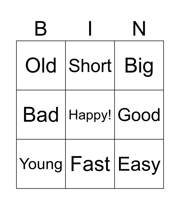 This bingo card has a free space and 8 words: Good, Big, Short, Young, Old, Easy, Bad and Fast.
