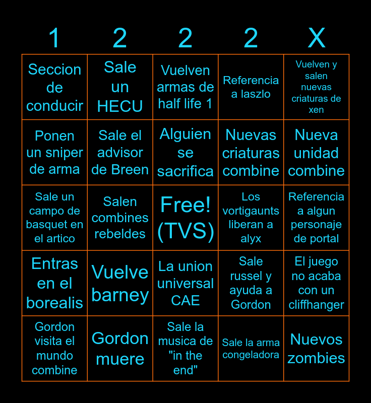 This bingo card has a free space and 24 words: Vuelve barney, Gordon muere, Alguien se sacrifica, Gordon visita el mundo combine, Vuelven y salen nuevas criaturas de xen, Seccion de conducir, Ponen un sniper de arma, Sale un HECU, Los vortigaunts liberan a alyx, La union universal CAE, Nuevas criaturas combine, Sale un campo de basquet en el artico, Sale russel y ayuda a Gordon, El juego no acaba con un cliffhanger, Sale el advisor de Breen, Sale la arma congeladora, Referencia a algun personaje de portal, Vuelven armas de half life 1, Nueva unidad combine, Salen combines rebeldes, Nuevos zombies, Entras en el borealis, Referencia a laszlo and Sale la musica de "in the end".