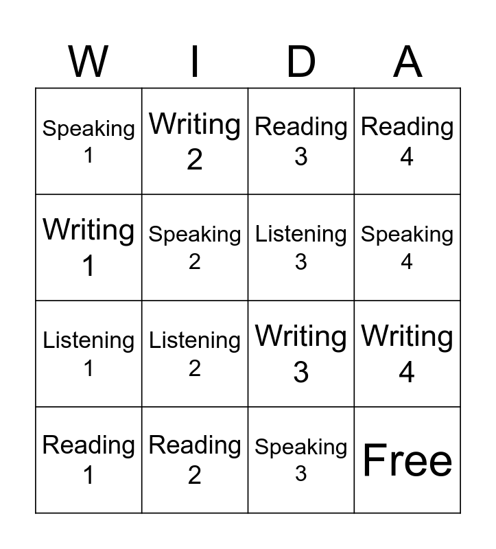 This bingo card has 16 words: Reading 1, Reading 2, Reading 3, Reading 4, Writing 1, Writing 2, Writing 3, Writing 4, Speaking 1, Speaking 2, Speaking 3, Speaking 4, Listening 1, Listening 2, Listening 3 and Free.