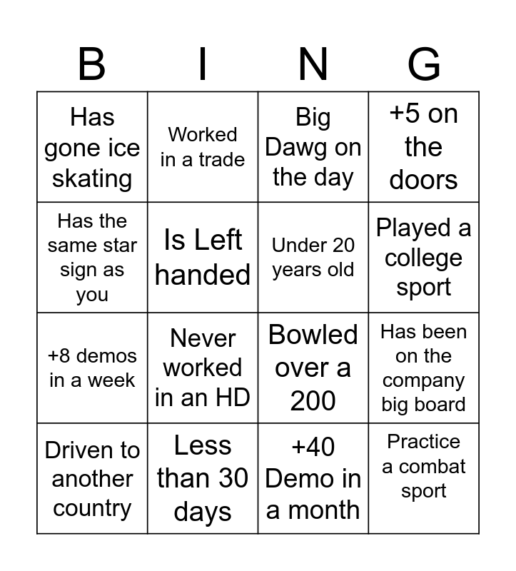 This bingo card has 16 words: Less than 30 days, Has been on the company big board, Big Dawg on the day, Has gone ice skating, +8 demos in a week, Worked in a trade, Bowled over a 200, +40 Demo in a month, Has the same star sign as you, Is Left handed, Driven to another country, +5 on the doors, Never worked in an HD, Played a college sport, Under 20 years old and Practice a combat sport.