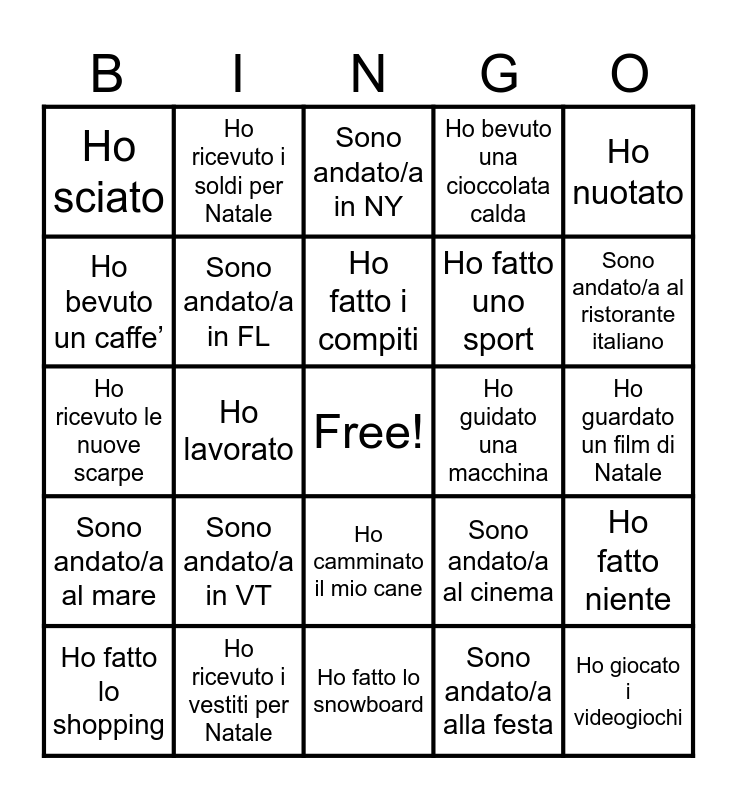 This bingo card has a free space and 29 words: Ho fatto lo shopping, Ho visitato i miei cugini, Ho lavorato, Ho cucinato, Ho sciato, Sono andato/a in NY, Sono andato/a in FL, Sono andato/a in VT, Ho guidato una macchina, Ho ricevuto i vestiti per Natale, Ho guardato un film di Natale, Ho giocato i videogiochi, Ho fatto lo snowboard, Sono andato/a alla festa, Sono andato/a al ristorante italiano, Sono andato/a in chiesa, Ho camminato il mio cane, Sono andato/a al mare, Ho nuotato, Ho ricevuto le nuove scarpe, Sono andato/a al cinema, Ho ballato, Ho fatto uno sport, Ho bevuto un caffe’, Ho bevuto una cioccolata calda, Ho ricevuto i soldi per Natale, Ho fatto niente, Ho fatto i compiti and Ero malato/a.
