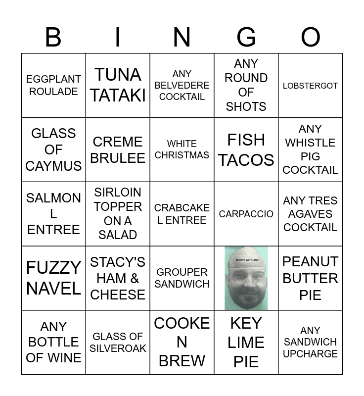 This bingo card has 1 images, a free space and 23 words: STACY'S HAM & CHEESE, GLASS OF SILVEROAK, WHITE CHRISTMAS, ANY BOTTLE OF WINE, LOBSTERGOT, EGGPLANT ROULADE, GLASS OF CAYMUS, TUNA TATAKI, CARPACCIO, GROUPER SANDWICH, FISH TACOS, SALMON L ENTREE, PEANUT BUTTER PIE, CREME BRULEE, KEY LIME PIE, ANY TRES AGAVES COCKTAIL, ANY BELVEDERE COCKTAIL, ANY WHISTLE PIG COCKTAIL, SIRLOIN TOPPER ON A SALAD, ANY SANDWICH UPCHARGE, FUZZY NAVEL, ANY ROUND OF SHOTS and COOKE N BREW.