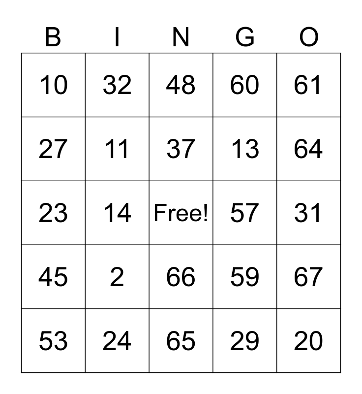 This bingo card has a free space and 24 words: 2, 24, 37, 53, 61, 10, 27, 32, 57, 66, 13, 23, 59, 67, 11, 29, 31, 48, 64, 14, 20, 45, 60 and 65.