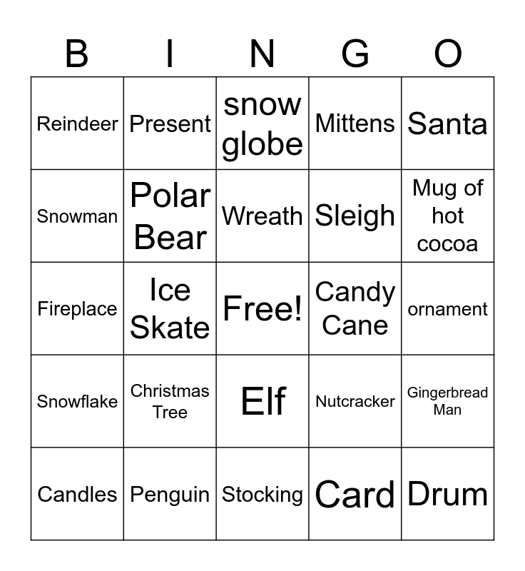 This bingo card has a free space and 25 words: Christmas Tree, Stocking, Wreath, Candles, Santa, Reindeer, Snowman, Present, Candy Cane, Elf, Sleigh, Fireplace, Nutcracker, Gingerbread Man, Polar Bear, Mistletoe, ornament, snow globe, Mug of hot cocoa, Ice Skate, Drum, Penguin, Snowflake, Mittens and Card.