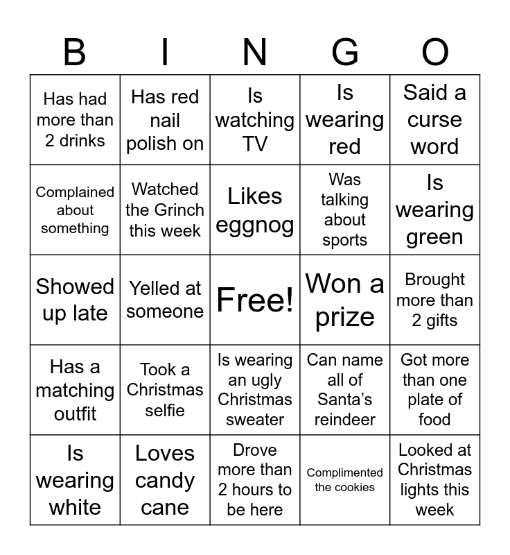 This bingo card has a free space and 25 words: Took a Christmas selfie, Drove more than 2 hours to be here, Likes eggnog, Is wearing white, Said a curse word, Has had more than 2 drinks, Complained about something, Has red nail polish on, Won a prize, Is wearing an ugly Christmas sweater, Was talking about sports, Showed up late, Can name all of Santa’s reindeer, Got more than one plate of food, Watched the Grinch this week, Has a December birthday, Brought more than 2 gifts, Is watching TV, Is wearing green, Yelled at someone, Looked at Christmas lights this week, Loves candy cane, Has a matching outfit, Is wearing red and Complimented the cookies.
