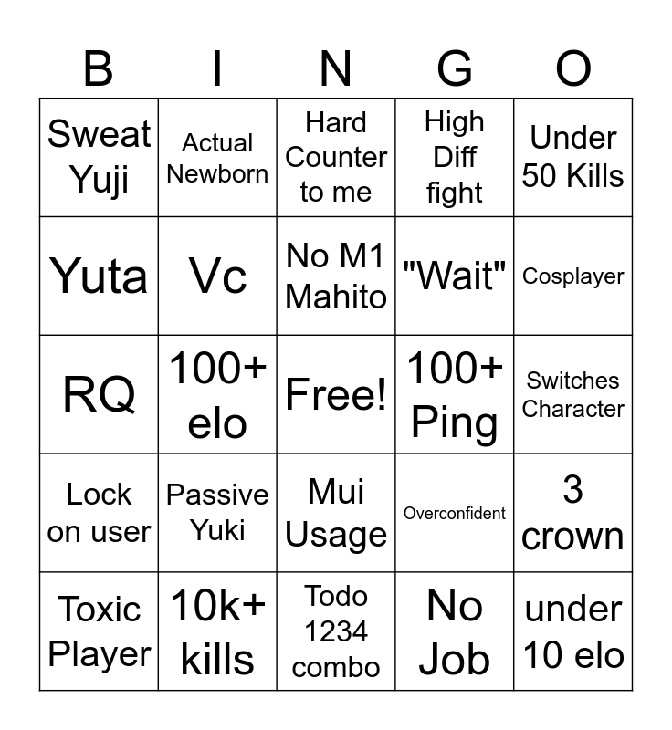 This bingo card has a free space and 24 words: Passive Yuki, 10k+ kills, No M1 Mahito, Toxic Player, Under 50 Kills, Sweat Yuji, Yuta, Actual Newborn, 100+ Ping, Mui Usage, "Wait", RQ, Overconfident, 3 crown, Vc, No Job, Switches Character, Hard Counter to me, Cosplayer, 100+ elo, under 10 elo, Lock on user, High Diff fight and Todo 1234 combo.