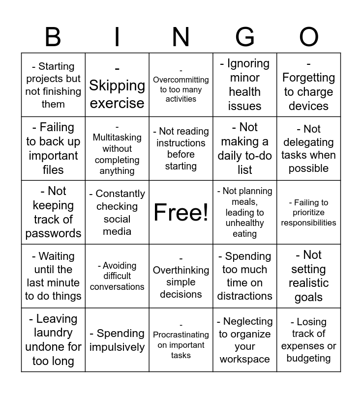 This bingo card has a free space and 31 words: - Procrastinating on important tasks, - Forgetting appointments or deadlines, - Constantly checking social media, - Misplacing keys or other essentials, - Starting projects but not finishing them, - Overcommitting to too many activities, - Multitasking without completing anything, - Spending too much time on distractions, - Not planning meals, leading to unhealthy eating, - Neglecting to organize your workspace, - Failing to prioritize responsibilities, - Losing track of expenses or budgeting, - Repeating the same mistakes, - Ignoring self-care or rest, - Not delegating tasks when possible, - Letting emails pile up without response, - Not setting realistic goals, - Avoiding difficult conversations, - Waiting until the last minute to do things, - Overthinking simple decisions, - Forgetting to charge devices, - Not preparing for meetings, - Leaving laundry undone for too long, - Skipping exercise, - Not making a daily to-do list, - Failing to back up important files, - Ignoring minor health issues, - Not keeping track of passwords, - Spending impulsively, - Not reading instructions before starting and - Neglecting regular vehicle maintenance.