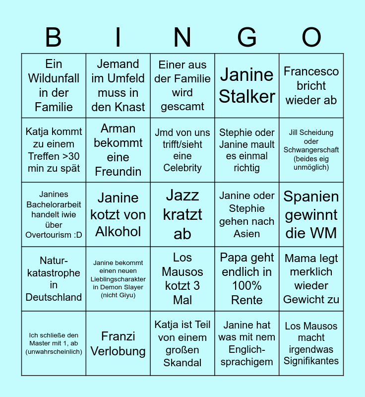 This bingo card has 25 words: Janine bekommt einen neuen Lieblingscharakter in Demon Slayer (nicht Giyu), Katja ist Teil von einem großen Skandal, Jmd von uns trifft/sieht eine Celebrity, Ich schließe den Master mit 1, ab (unwahrscheinlich), Francesco bricht wieder ab, Ein Wildunfall in der Familie, Katja kommt zu einem Treffen >30 min zu spät, Jemand im Umfeld muss in den Knast, Janine oder Stephie gehen nach Asien, Los Mausos kotzt 3 Mal, Stephie oder Janine mault es einmal richtig, Janines Bachelorarbeit handelt iwie über Overtourism :D, Papa geht endlich in 100% Rente, Mama legt merklich wieder Gewicht zu, Arman bekommt eine Freundin, Los Mausos macht irgendwas Signifikantes, Spanien gewinnt die WM, Einer aus der Familie wird gescamt, Jill Scheidung oder Schwangerschaft (beides eig unmöglich), Janine kotzt von Alkohol, Jazz kratzt ab, Franzi Verlobung, Natur-katastrophe in Deutschland, Janine Stalker and Janine hat was mit nem Englich-sprachigem.