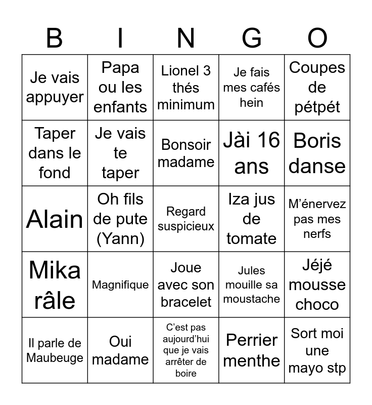 This bingo card has a free space and 24 words: Magnifique, Oui madame, Bonsoir madame, Il parle de Maubeuge, Coupes de pétpét, Je vais appuyer, Taper dans le fond, Papa ou les enfants, Iza jus de tomate, Joue avec son bracelet, Jài 16 ans, Alain, Jules mouille sa moustache, Jéjé mousse choco, Je vais te taper, Perrier menthe, M’énervez pas mes nerfs, Lionel 3 thés minimum, Boris danse, Oh fils de pute (Yann), Sort moi une mayo stp, Mika râle, Je fais mes cafés hein and C’est pas aujourd’hui que je vais arrêter de boire.