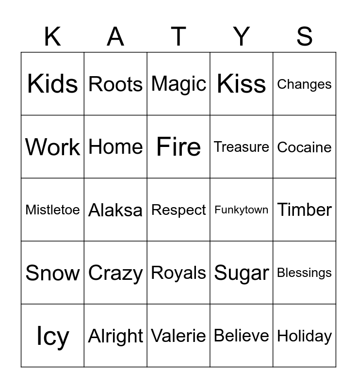 This bingo card has 34 words: Holiday, Believe, Happy, Lights, Snow, Home, Changes, Icy, Roots, Celebration, Fire, Magic, Smooth, Halo, Funkytown, Cocaine, Alright, Mistletoe, Crazy, Sugar, Royals, Hallelijah, Kids, Timber, Valerie, Respect, Kiss, Tambourine, Treasure, Work, Glow, Alaksa, Blessings and Goodies.