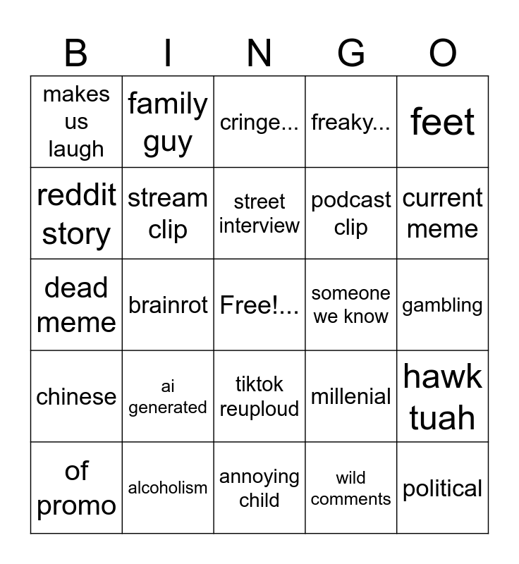 This bingo card has a free space and 24 words: ai generated, alcoholism, street interview, of promo, feet, makes us laugh, reddit story, family guy, someone we know, tiktok reuploud, podcast clip, dead meme, millenial, hawk tuah, stream clip, wild comments, gambling, cringe..., current meme, brainrot, political, chinese, freaky... and annoying child.